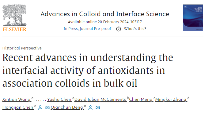 导读:20242月,suncitygroup太阳成集团陈洪建博士作为第一通讯作者在国际食品Top期刊《Advances in Colloid and Interface Science》(Q1IF: 15.6)发表题为“Recent advances in understanding the interfacial activity of antioxidants in association colloids in bulk oil”综述论文。中国农业科公司油料作物研究所博士研究生王新天为第一作者,通讯作者为suncitygroup太阳成集团陈洪建特任副研究员和中国农业科公司油料作物研究所邓乾春研究员。